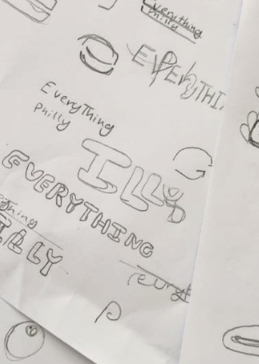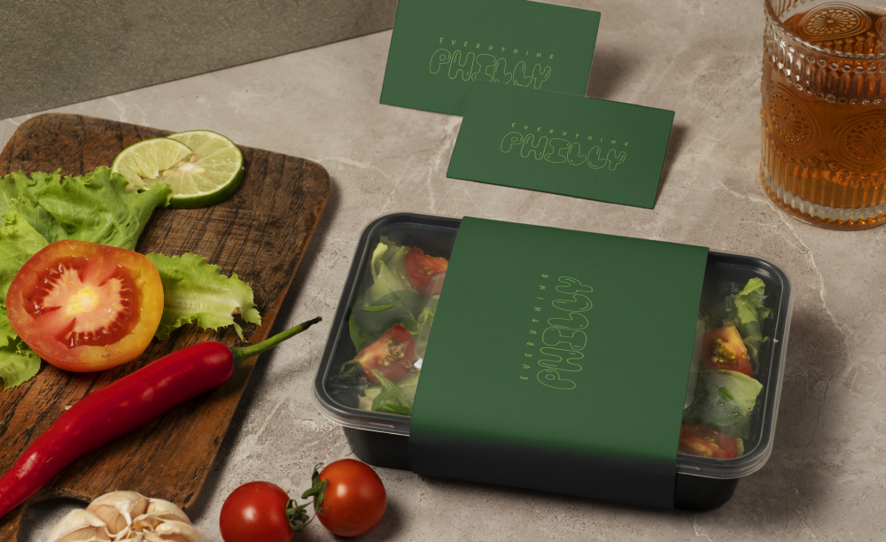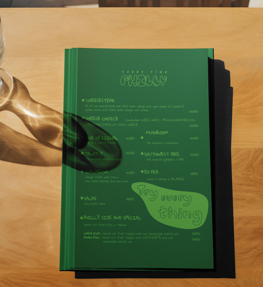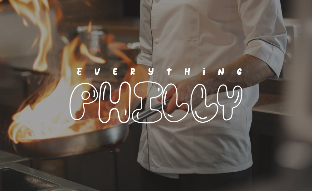 كلمة “PHILLY” مكتوبة بخط منتفخ ومستدير، مستحضرة فكرة الساندويتش المليء بالحشوة الوفيرة. فورًا توصل شعور الشبع والرضا — تلميح إلى وعد العلامة التجارية بتقديم حصص سخية وتجارب لذيذة.
